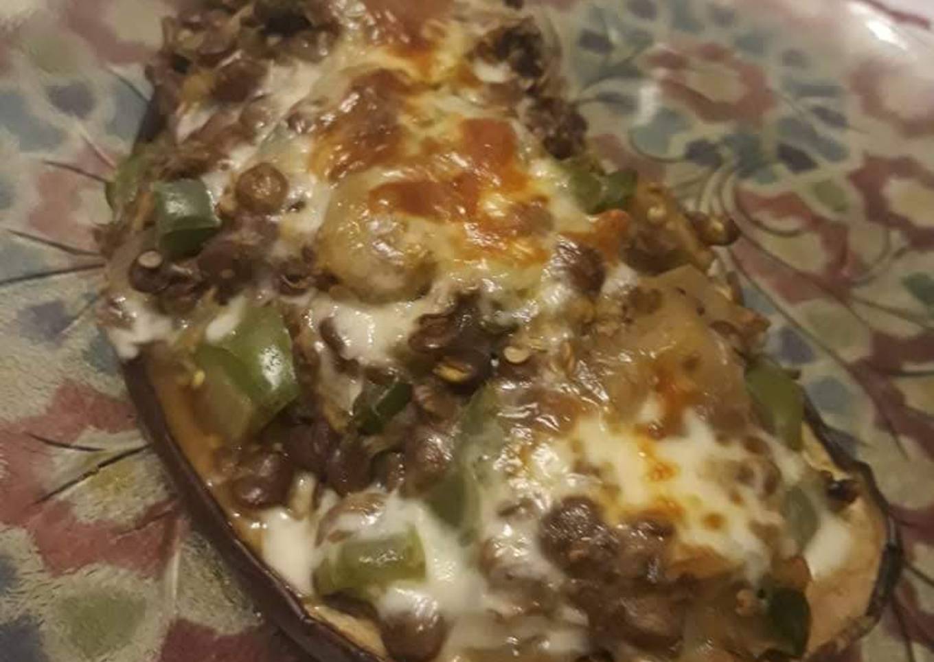- En una olla, rehogar morrón, cebolla, ajo, puerro, verdeo cortados pequeños. Condimentar con sal, pimienta, nuez moscada, y lo que gusten. También pueden agregar perejil fresco picado. Una vez cocidos, sumar las lentejas, la pulpa de las berenjenas y el queso cortado en cubitos. Mezclar.