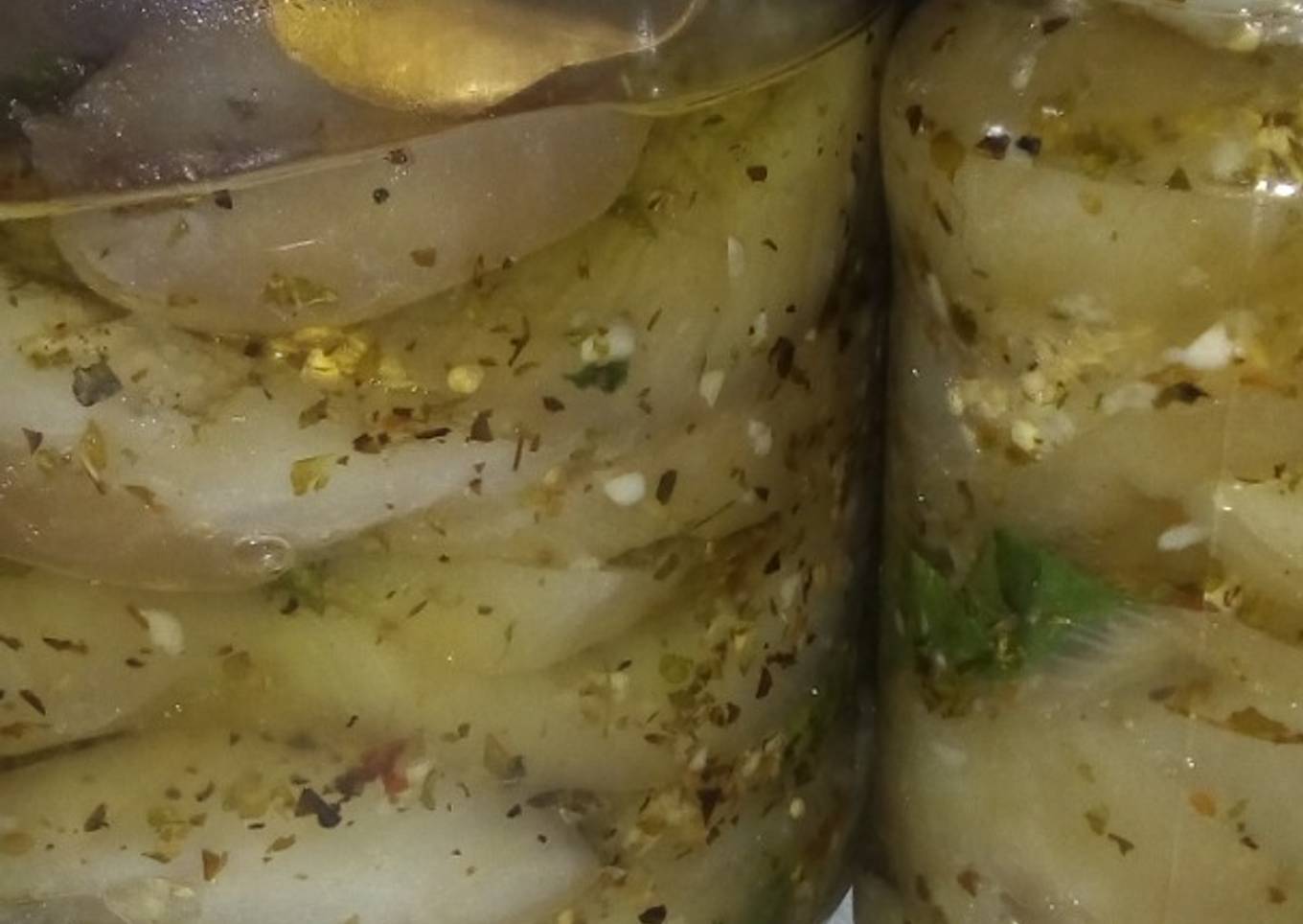 - Una vez fr铆as las berenjenas, vamos agregando en los frascos una capa de 茅stas y unas cucharas de las especies en aceite, y 2 hojas de laureles por frasquito, as铆 hasta llegar a arriba del frasco, luego lo terminamos de cubrir con aceite.