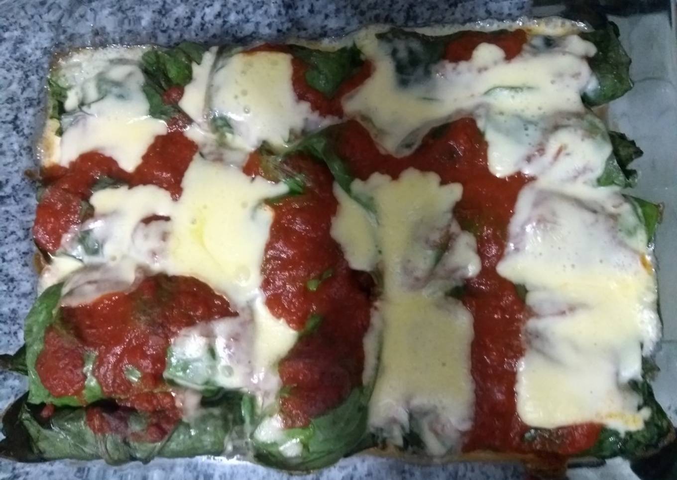- Vamos rellenando hoja por hoja y enrollamos tipo canelón y los ponemos en una fuente