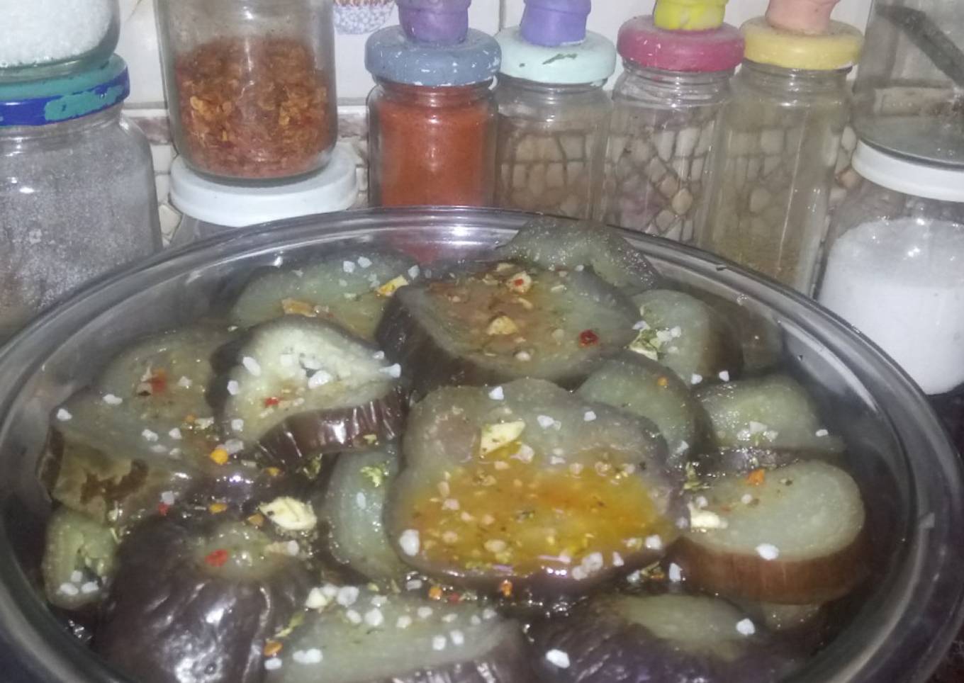 - En un bowl poner una cucharada de la mezcla de aceite y condimentos, acomodar una capa de berenjenas, volver a poner aceite, otra capa de berenjenas y asà hasta completar.