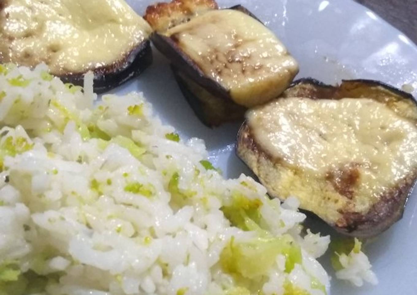 Berenjenas gratinadas con queso al horno, acompañadas con una guarnición de arroz mezclado con brócoli.
