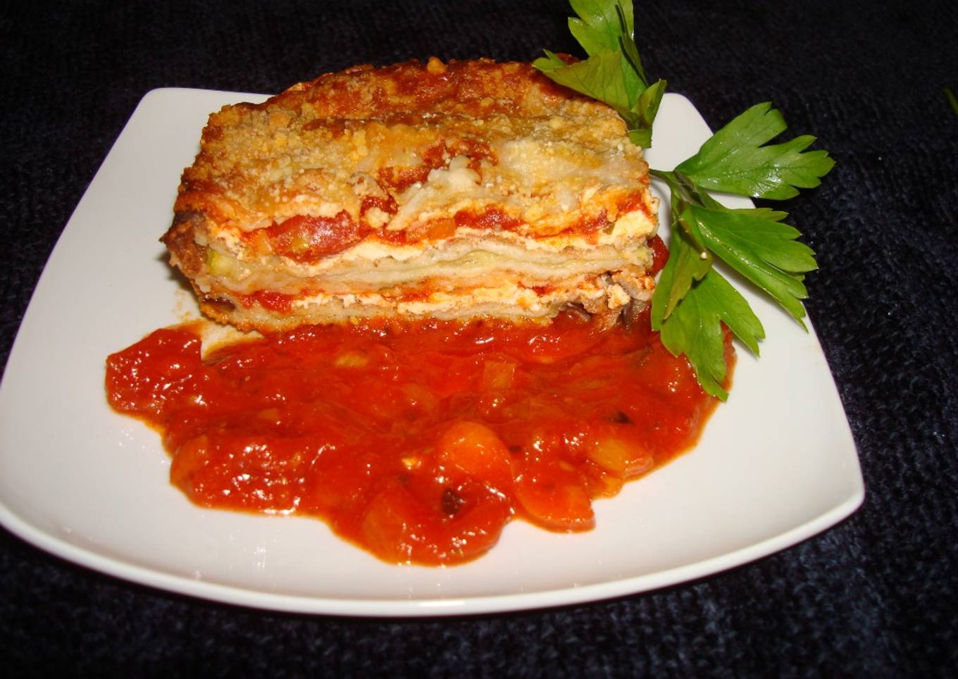 Repetir el proceso de queso ricota, salsa de tomate, mozarela y queso parmesano.