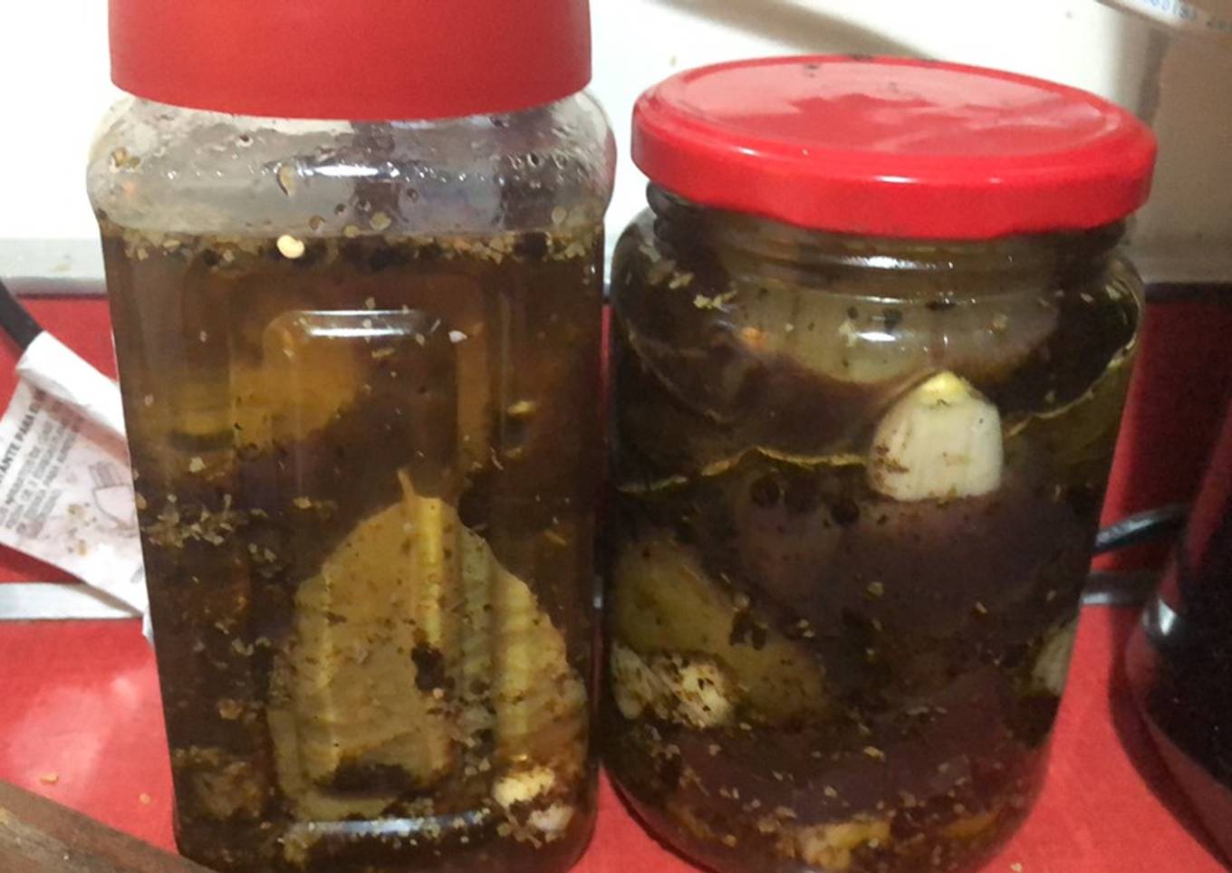 - Colocar en frascos de vidrio limpios y condimentar con los ajos y demás ingredientes, agregar aceite hasta taparlas por completo, dejar macerar por lo menos una semana... o hasta que aguantes!! 🤤
