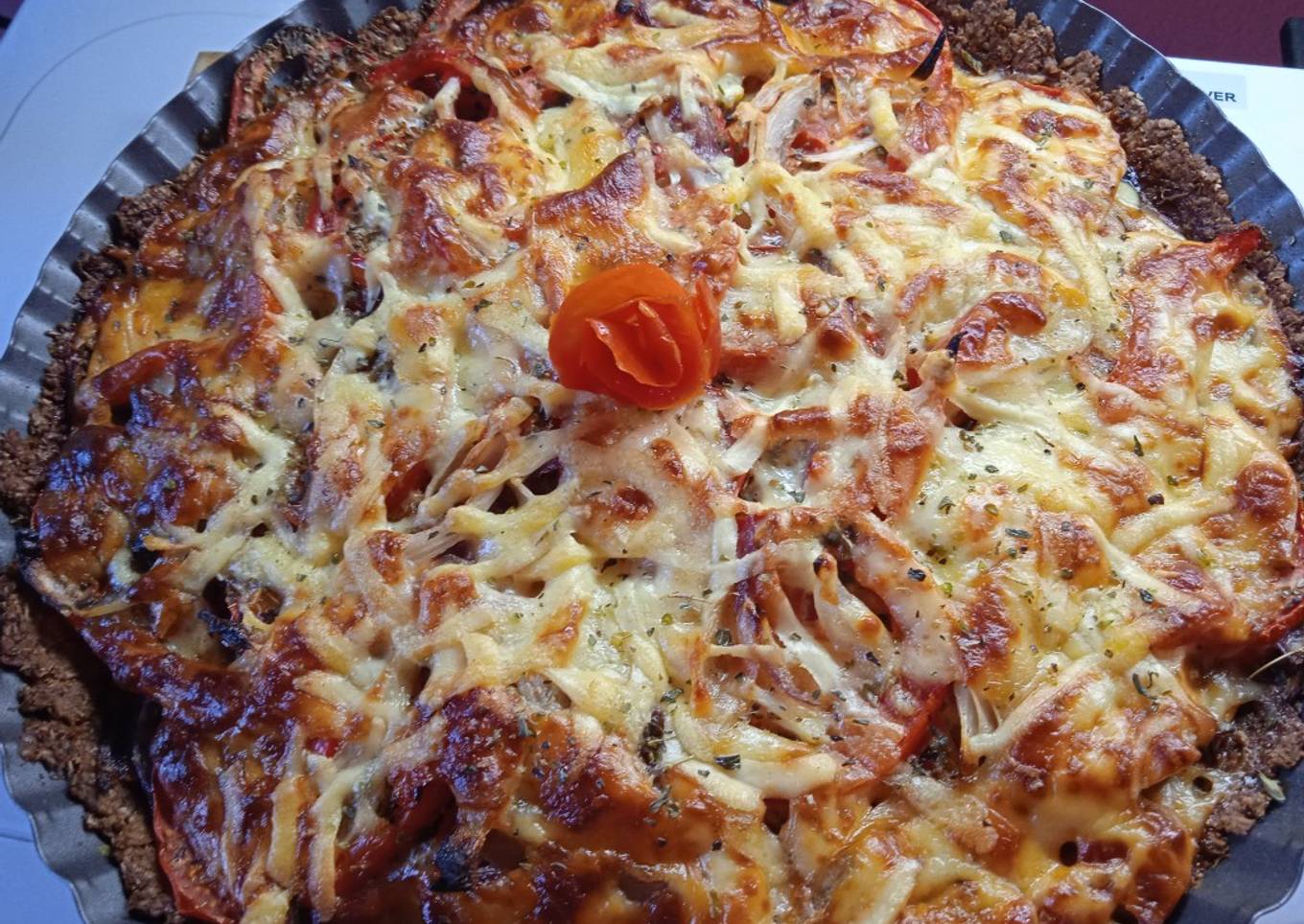 Tarta de berenjenas, con tomates, cebolla, morrón y queso