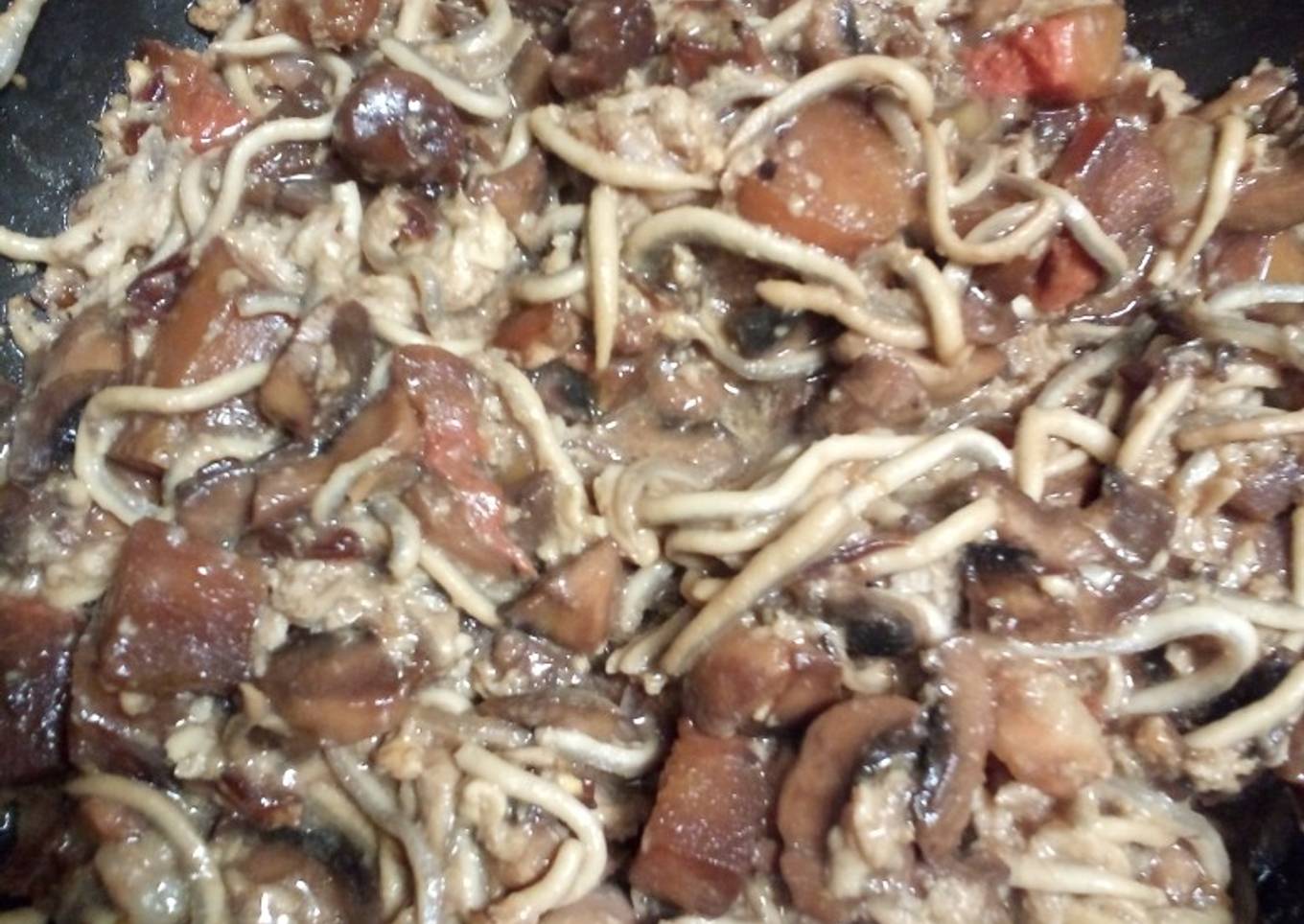 Revuelto de gulas, champis y calabaza con salsa de soja