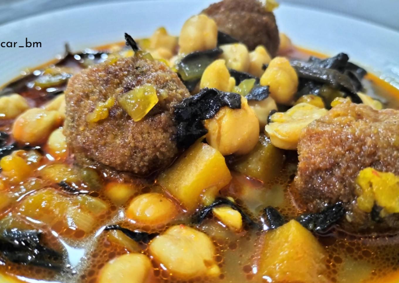 Potaje de garbanzos con calabaza y trompetas de la muerte