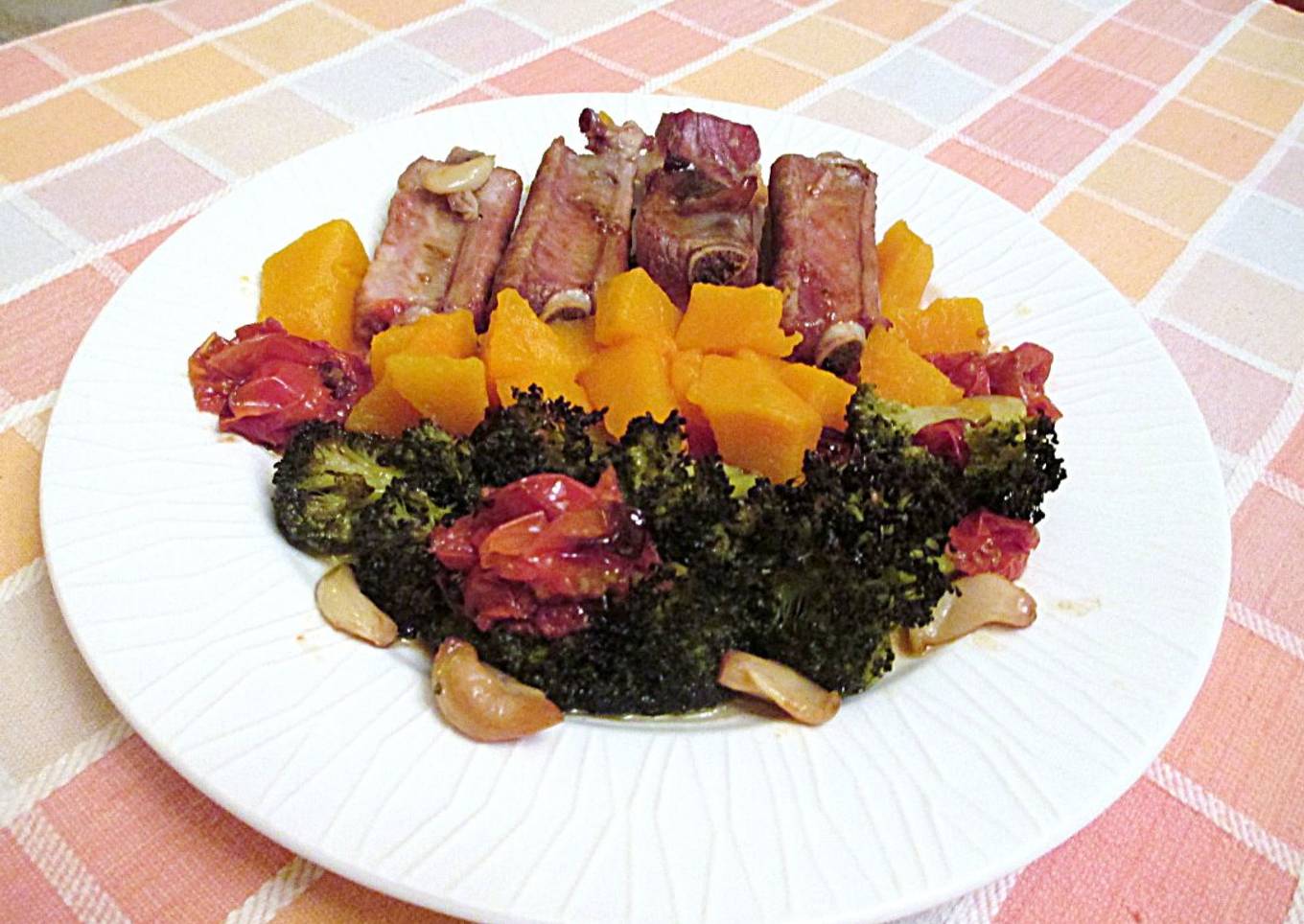 Costillas de cerdo con calabaza y brócoli al vino blanco