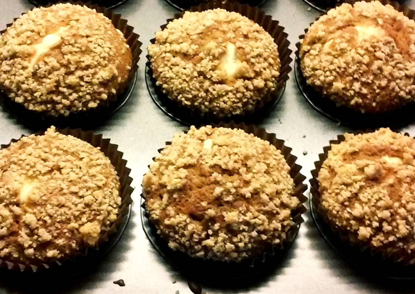 - En un molde para muffins, ponemos las cápsulas de papel y las llenamos con la masa hasta la mitad e introducimos un trozo de queso crema, añadimos un poco más de masa hasta que lo cubra totalmente y espilvoreamos con el strusel preparado prevismente.