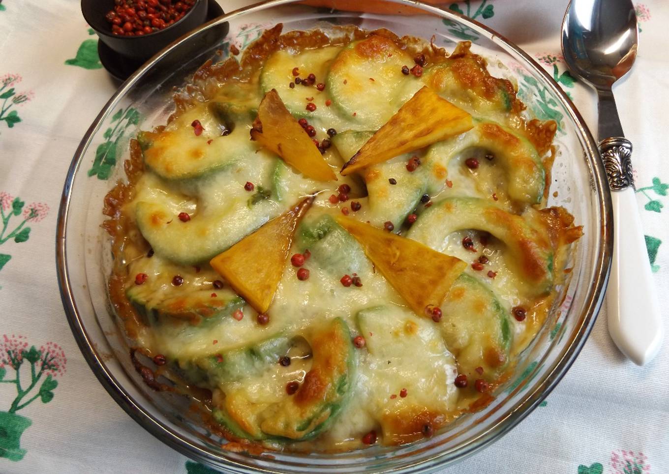 - Pelar el aguacate, quitar el hueso (carozo) y cortar en rodajas. Distribuir en la fuente y cubrir con el queso. Llevar a horno precalentado a 220º hasta que este dorado y caliente.
